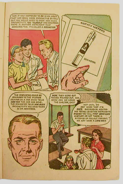 At the back of the comic, there is a civil defense-oriented crossword puzzle (e.g., what is an eight letter word for "640-1240 emergency broadcasting system" and a glossary (e.g., the definition of "fire storm").