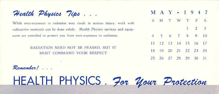 These ink blotters (9" x 4") were designed and distributed at Oak Ridge National Laboratory in 1947. Each month, a different health physics tip was presented. In some cases, the tip corresponded to a poster that was also distributed around the laboratory. In the days of ink wells and fountain pens, a blotter would be gently placed on a page of writing to help it dry.