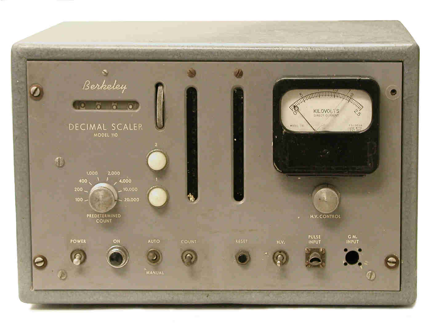 The Model 110 was manufactured by Berkeley Scientific Company of Richmond California (later acquired by Tracerlab). It and the Model 100 were advertised in March 1951 as “2 NEW Berkeley SCALERS, Quality Instruments at NEW LOW COST.” While the two models were very similar, the Model 110 could supply either a positive or negative high voltage, which permitted its use with either a GM or scintillator. Another difference was that the Model 110 had a preset count capability which permitted a determination of the time required to obtain a selected count.