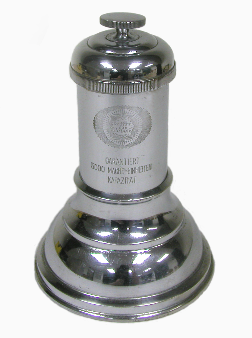 Many similar devices were also available. Among the better known were the Thomas Cone, the Zimmer Emanator, and the Radium Emanator. However, these devices were placed in the water instead of the water being placed in them. They had the advantage of being less expensive than the Revigator and were small enough to fit in a suitcase. With one of these, you could enjoy the benefits of radon on the road as well as at home.