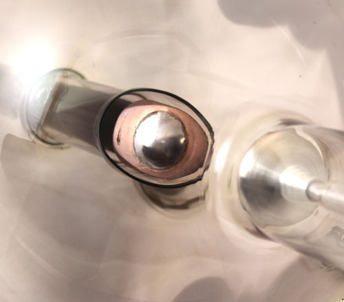 The image to the left is a nice close-up of the tube's tungsten target (anticathode). The cathode is seen to the right. What is unusual is that the tungsten is convex rather than flat. Even the surface of the copper has a slight curve to it. Since the target was convex, any reflected electrons would spread out rather than strike a single point on the glass wall of the tube.